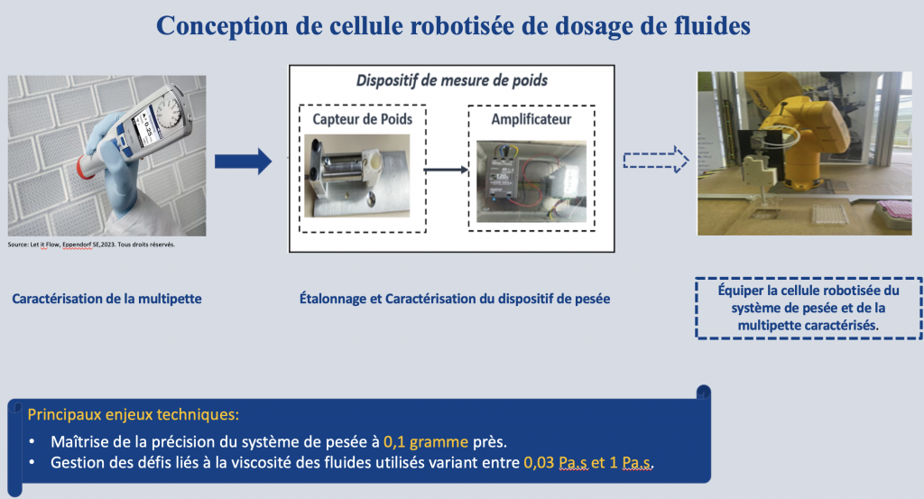 Ce projet a pour but de concevoir et mettre en place une cellule robotisée de démonstration destinée au remplissage automatique au du 10ème de gramme de tubes de screening par des fluides faiblement à fortement visqueux. La cellule sera composée de 3 dispositifs principaux : un robot STAÜBLI à 4 axes destiné à manipuler les tubes de screening. La seconde dispositif assurera le remplissage en étant capable de doser précisément des fluides de viscosités variables. Il sera asservi en temps réel à un système de pesée précis et répétable. Ces deux derniers systèmes seront à concevoir et réaliser. La loi de de régulation sera élaborée et optimisée afin d’obtenir le remplissage voulu. Enfin, un automate assurera la communication entre le robot et le dispositif de remplissage.