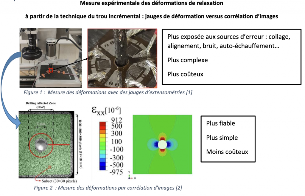 Ce projet fait suite à mes travaux de thèse réalisés au LPMT sous la direction de Gildas L’Hostis, Marie-José Pac et Sylvain Giljean. Ces travaux ont permis de développer un dispositif de mesure des contraintes résiduelles par la méthode du trou incrémental, utilisant des jauges de déformation. Cependant, ces jauges présentent plusieurs limites (collage, alignement, bruit, auto-échauffement), sources potentielles d’erreurs. Le projet vise à remplacer cette instrumentation par une méthode optique par corrélation d’images, plus fiable et plus simple à mettre en œuvre. Les résultats seront comparés à ceux obtenus avec les jauges et validés sur un échantillon de référence.