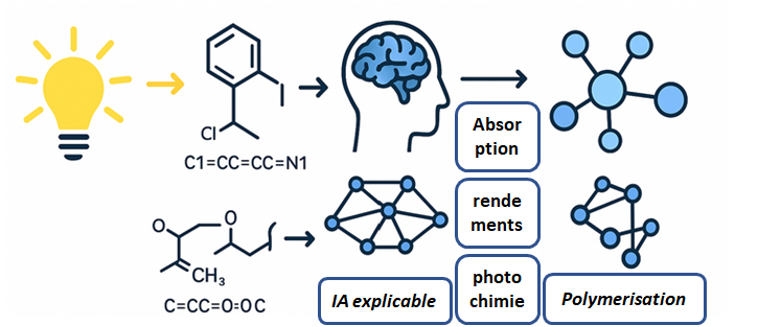 Ce projet vise à accélérer la conception de nouveaux photoamorceurs et formulations photopolymères grâce à l’intelligence artificielle. Après la constitution d’une base de données regroupant structures moléculaires et propriétés physico-chimiques, des algorithmes de machine Learning seront déployés pour établir des corrélations entre structure et performance photochimique. Une attention particulière sera portée aux modèles prédictifs et à l’IA explicable (XAI) afin de concevoir des molécules innovantes tout en rendant les mécanismes décisionnels transparents. Ce projet vise à ouvrir la voie à des développements plus avancés, allant de la prédiction de propriétés photochimiques à l’optimisation automatique de formulations pour la photopolymérisation.